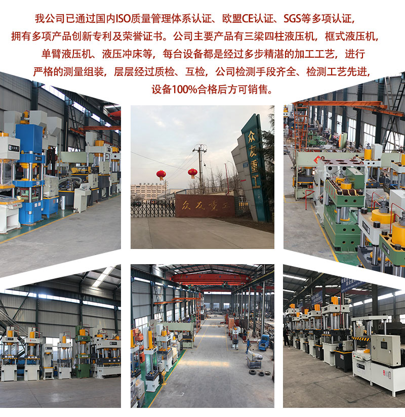 滕州眾友重工機械設備有限公司是我國油壓機、壓力機專業生產企業之一, 公司擁有大型落地鏜銑床、重型車床、銑床刨床等設備,工藝裝備先進,專業生產常規油壓機、四柱油壓機、小型油壓機、單臂油壓機、多功能油壓機、框式油壓機、龍門油壓機、臥式油壓機、三梁四柱油壓機各類油壓機及汽保設備。公司與多家國有大型企業、獨資合資及民營企業服務配套數十臺,深受用戶歡迎